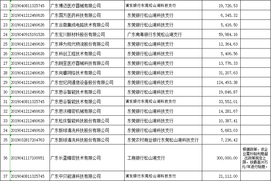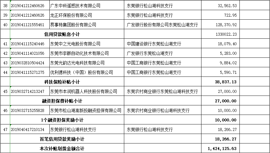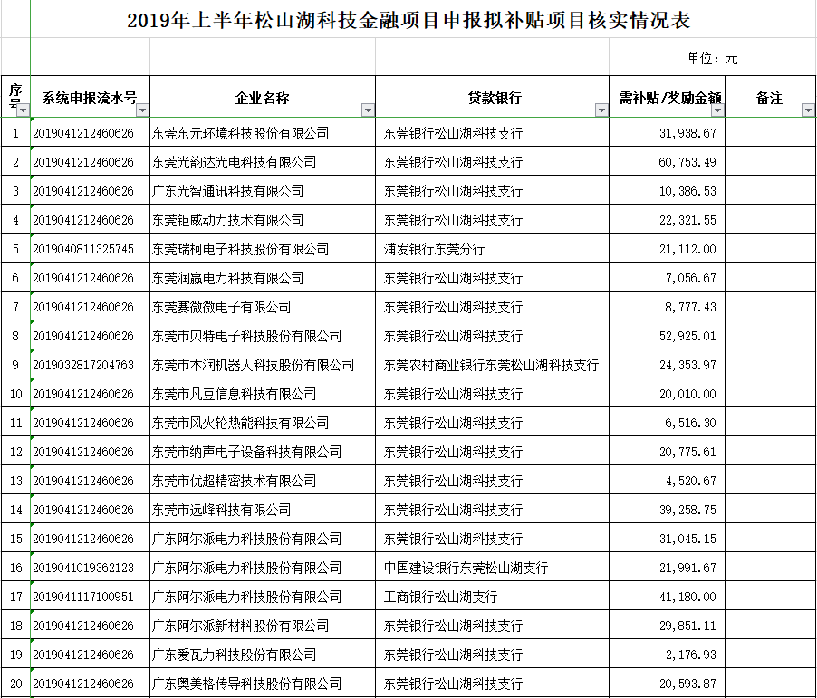 根据《东莞松山湖高新区促进科技金融发展实施办法》有关规定,经管委会同意,现将于近期下达2019年科技金融补贴与奖励资金给东莞东元环境科技股份有限公司等单位,补及奖励金额合计1424125.63元。请各受资助单位按照会计规范做好财政资助资金的会计处理,如有疑问,请及时与我局联系,联系人:尹幸源,联系电话:22893363。